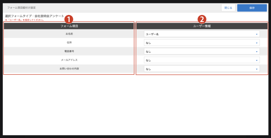 ①のフォーム項目はお問い合わせフォームの項目になります。②のユーザー情報で、各機能のユーザー登録時に必要な項目がセレクトボックスで表示されるため、どの項目に紐づけるか設定し、【保存】ボタンをクリックしてください。