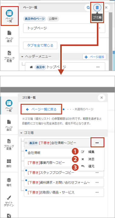 - ゴミ箱(ページ復元)の保管期限は3か月です。 期限を過ぎると自動的にゴミ箱から完全消去され、復元不可となりますのでご注意ください。