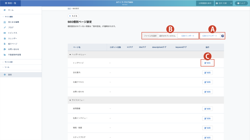全ページのSEO設定のCSVファイルを、お使いのPCにエクスポートできます。 CSVファイルはExcelなどで開いて編集することができます。