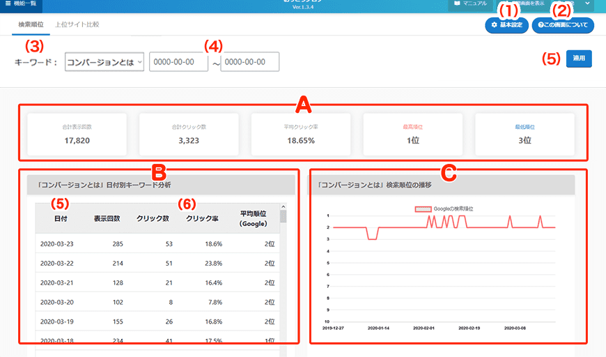 C.検索順位の推移………設定した期間の検索順位推移をグラフで確認できます。グラフにマウスオーバーすると詳細な数値を確認できます。