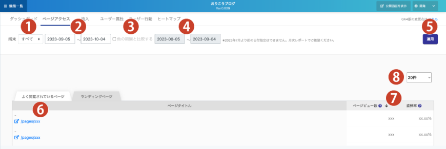 ⑦ページビュー数、直帰率が表示されます。各データ名横をクリックすると多い順にソートをかけることができます。