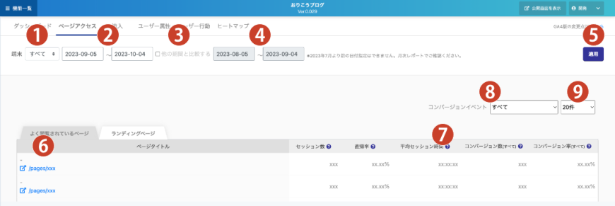 ⑧目標ページ………Google アナリティクスで設定した目標ページ(※)が表示されます。確認したいページを選択できます。