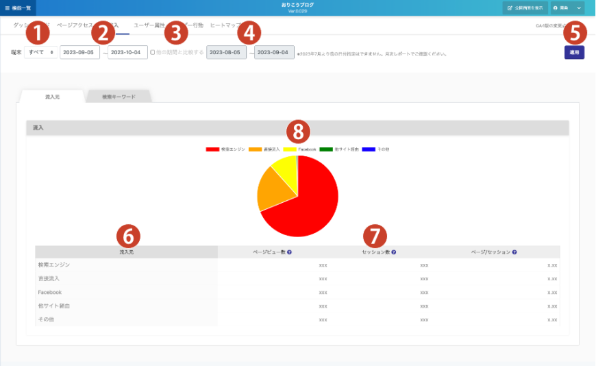 ⑧グラフ………流入元の割合を円グラフで確認できます。