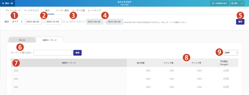 ⑦検索キーワード………表示回数の多いキーワード順にキーワードが表示されます。