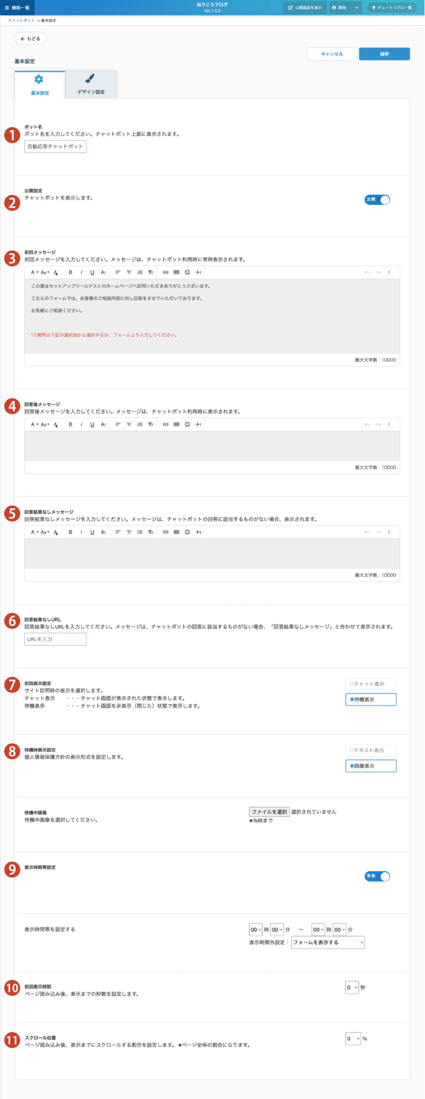 ⑦初回表示設定………チャットボットの「チャット」を表示するか、「待機中」表示をするか選択できます。