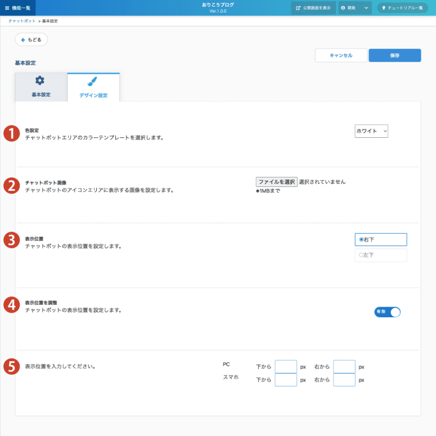 ボット管理は、「基本設定」「デザイン設定」「選択肢設定」などの設定画面がタブで分かれており、ページ上に表示するチャットボットの各設定をここで行います。