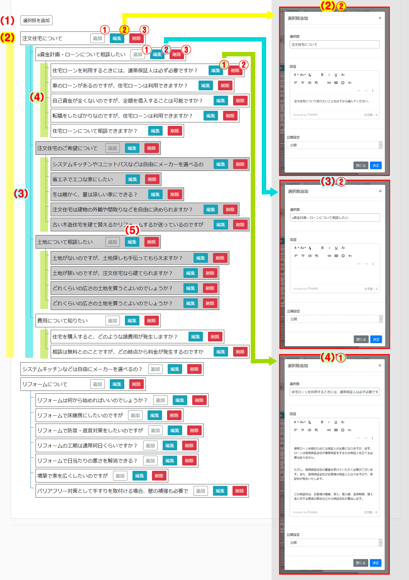 ⑤回答結果なしメッセージ………チャットボットの回答に該当するものがない場合に表示するメッセージを入力できます。