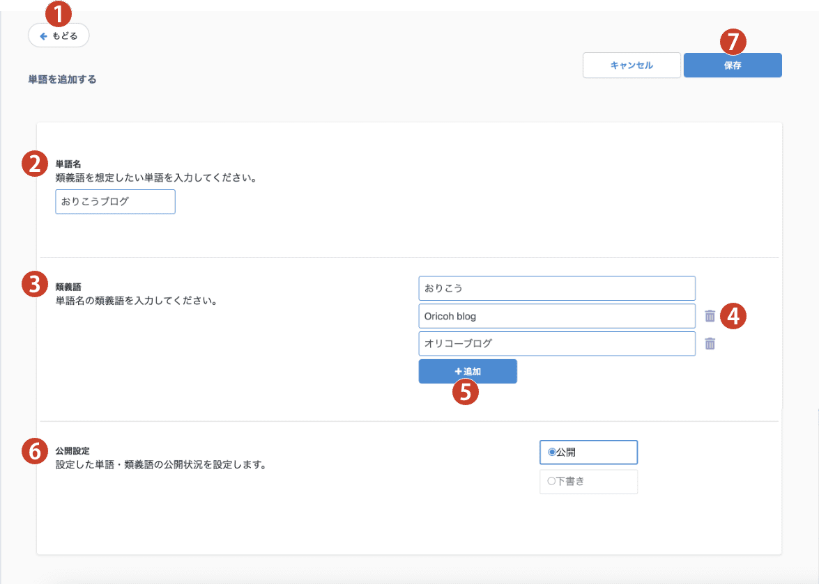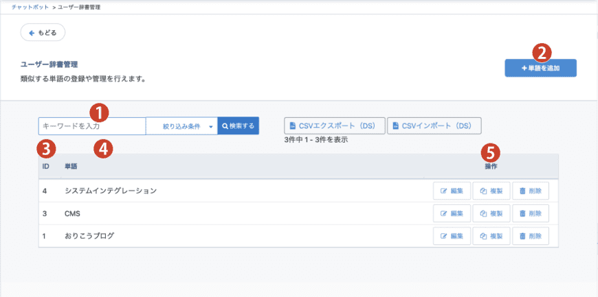 ユーザー辞書管理は、あらじめ単語を設定し、その単語の類義語を管理、設定します。