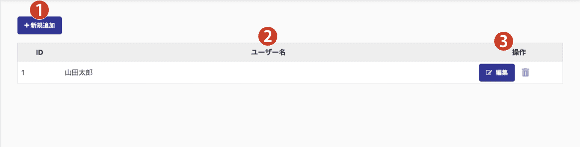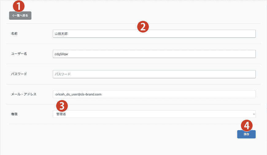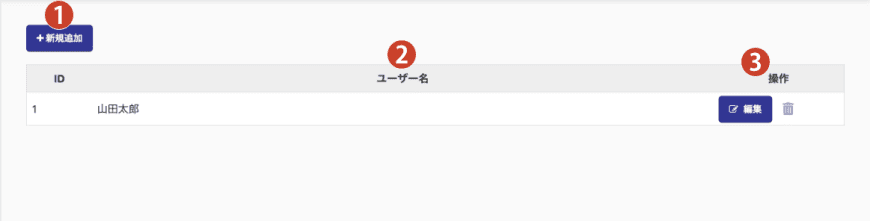 ユーザー管理とは ユーザー管理は、チャットボットの管理者を権限に応じて登録できる機能です。 一覧画面 ①新規追加………管理者追加画面に遷移します。名前、ユーザー名、パスワード、メールアドレスを入力し、権限を選択登録できます。②ユーザー名………ユーザー名を表示します。③操作………管理者ユーザーを編集、削除が行えます。 ③操作→編集 ①一覧へ戻る………一覧画面に移動します。②名前、ユーザー名、パスワード、メール・アドレスを入力します。③権限………スーパーユーザー、管理者、メンバーを選択できます。
