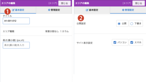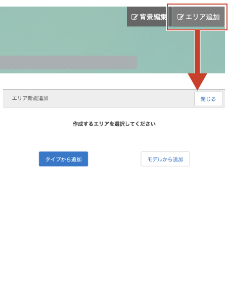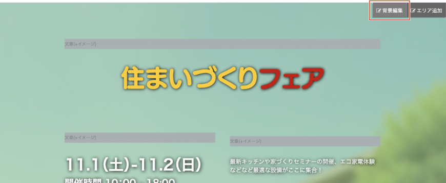 エリアの背景は、みたまま編集上から行えます。エリアの右上に表示される【背景編集】ボタンをクリックすると、エリアの背景編集パネルが表示されます。