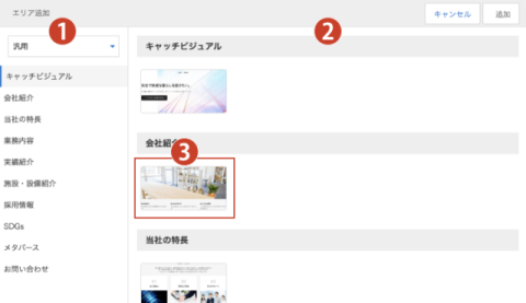 おりこうブログでは、 会社概要などのこれまでの通常ページに加えて、2分割などのレイアウトを持つ「エリア」を組み合わせてページを作成できます。