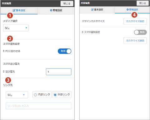 ③リンク設定………なし、URL入力、ページ選択、お問い合わせを選択できます。