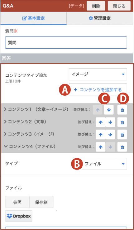 コンテンツは1データ10件まで追加でき、"文章+イメージ"、"イメージ"、"文章"、"ファイル"、"HTMLタグ" からタイプを選択できます。