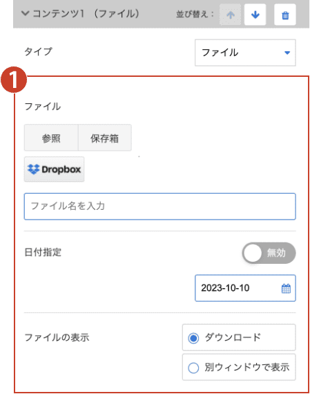 ファイルへのリンクをクリックした時に、ファイルを閲覧者のPCに"ダウンロード"させるか、ブラウザの"別ウィンドウで表示"させるかを選択します。