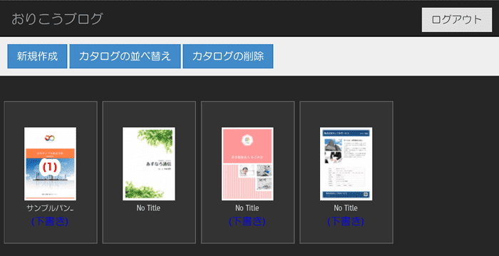 メインメニュー画面で、ページを追加・差し替えを行いたいカタログの(1)サムネイル画像を押します。