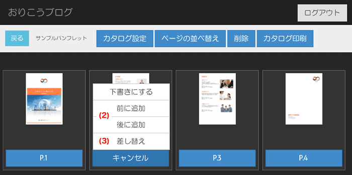 メニューから(2)前に追加、後に追加のどちらかページを追加したい位置を選択します。