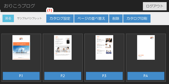 設定を行いたいカタログのページ一覧画面にて、(1)カタログ設定ボタンを押します。