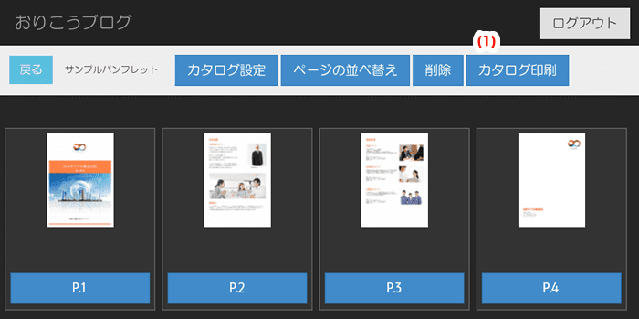 印刷を行いたいカタログのページ一覧画面にて、(1)カタログ印刷ボタンを押します。