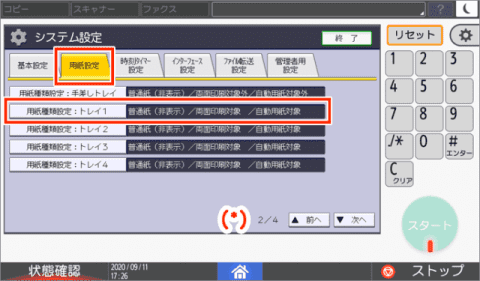 (*)用紙設定画面は右下のページングを操作して各項目に関してのトレイを表示します。