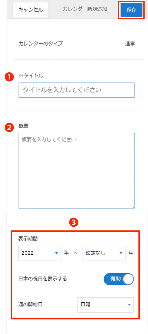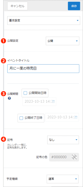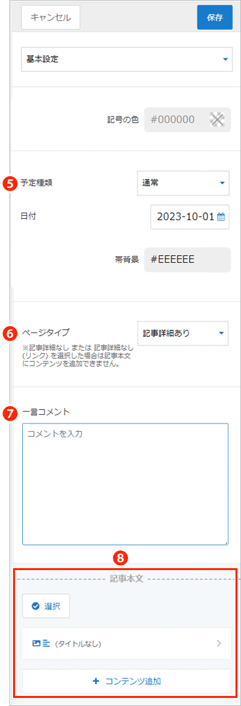 基本設定の「ページタイプ」が ”記事詳細あり” に設定している場合、フォーム付イベントの作成が行えます。