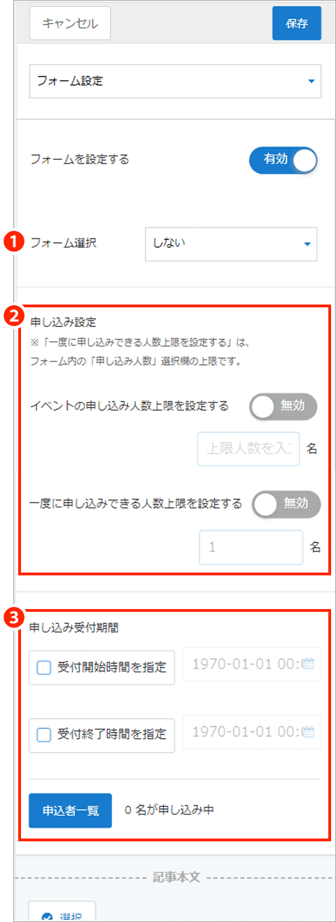 設置したフォームで「イベントの申し込み上限人数」、「一度に申し込みできる人数上限数」をそれぞれ設定することができます。
