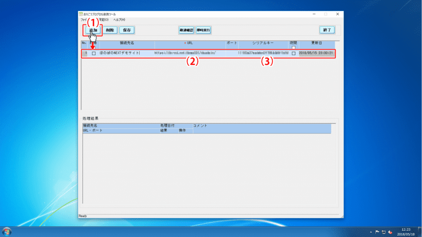 新たな接続先として追加されたリストの(2)"URL"、(3)"シリアルキー"という項目に、“おりこうブログ外部連携サービス -> ほのぼのNEXT連携“ に表示されている設定値を入力すると、連携が完了します。