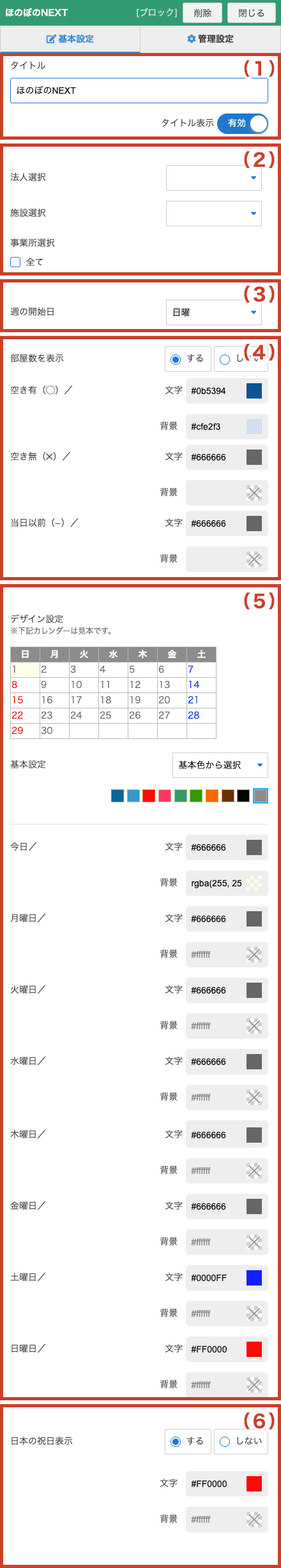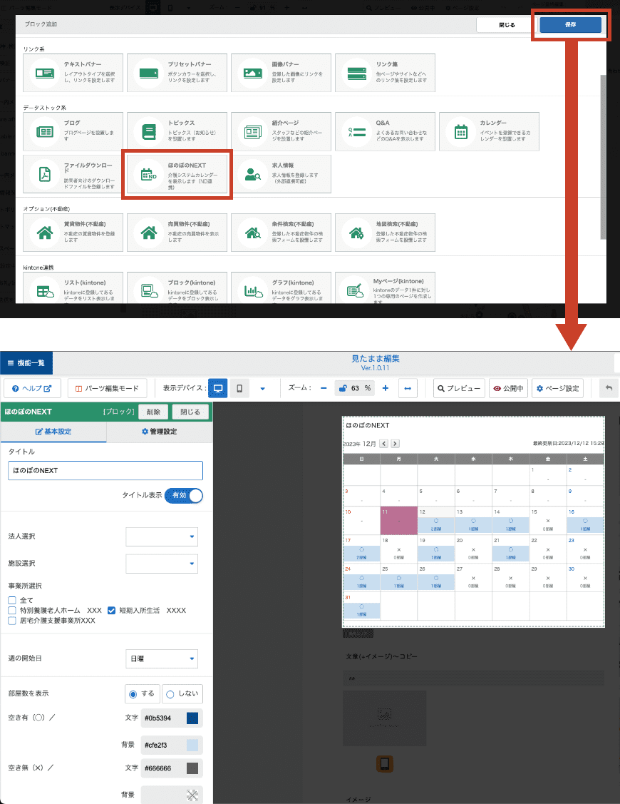 ブロック編集パネルの基本設定欄で"法人選択"、"施設選択"、"事業所選択"を行い、パネル右上の【保存】をクリックすると、完了です。