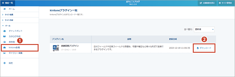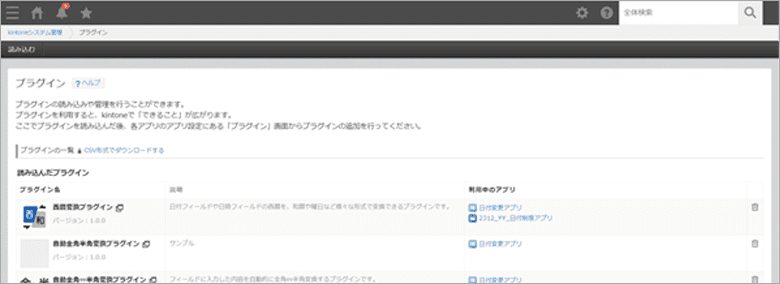 「kintoneプラグイン一覧」の画面では、kintoneアプリ側の拡張機能をダウンロードでき、ダウンロードしたファイルをkintoneアプリ側で設定してご利用いただけます。