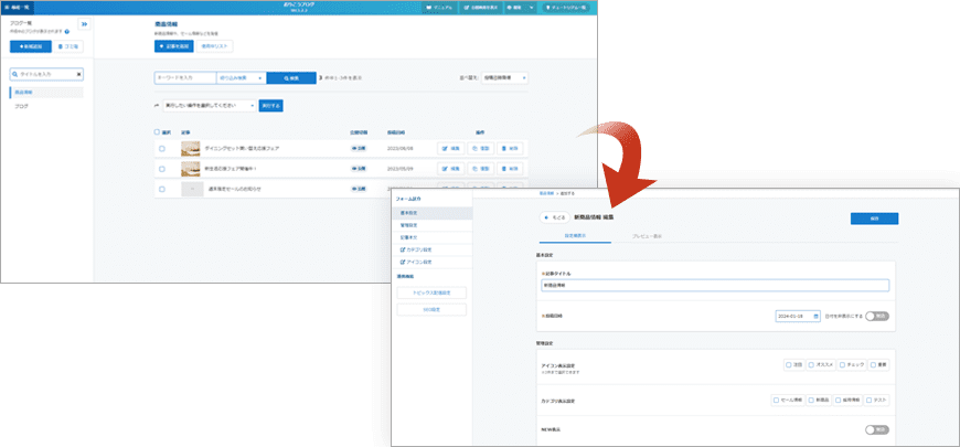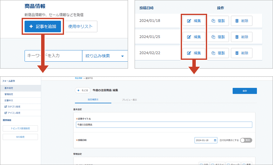 画面上部の「追加」ボタン、または作成済みのデータの「編集」ボタンをクリックすると、データ編集画面に移動して各種編集を行うことが出来ます。