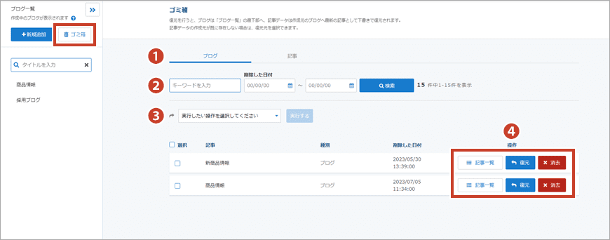 ②ゴミ箱 では、削除したデータストック・データの確認や復元が行えます。詳しくはこちら