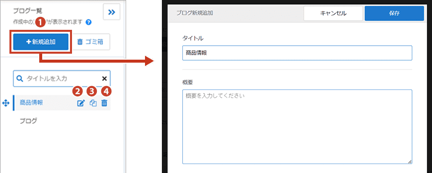 ①新規追加 … クリックするとデータストックの新規追加画面を開き、タイトル等の設定が行えます。