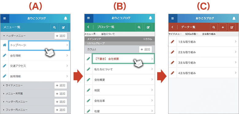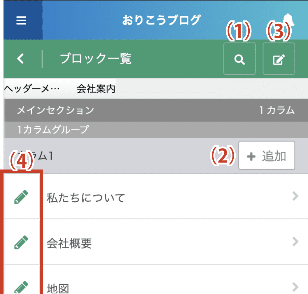 選択したページに所属してるブロックの一覧が表示されます。ブロックの作成・管理を行います。タイトルをタップすると、選択したブロックに所属しているデータの一覧が表示されます。