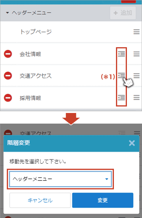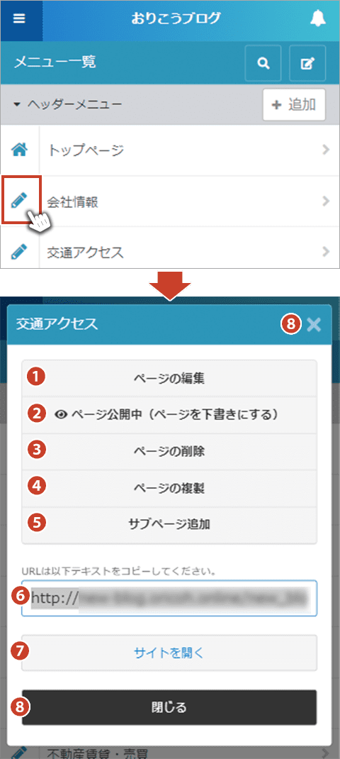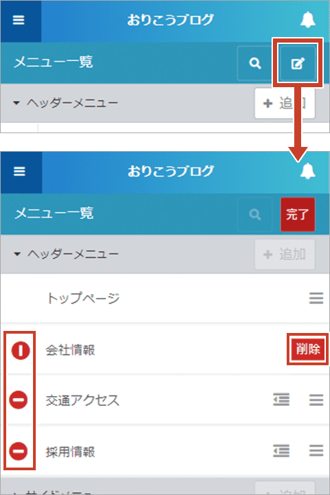 作成したメニュー(ページ)の一覧が表示されます。各メニューに所属しているページの作成・管理を行います。タイトルをタップすると、選択したメニュー(ページ)に所属しているブロックの一覧が表示されます。