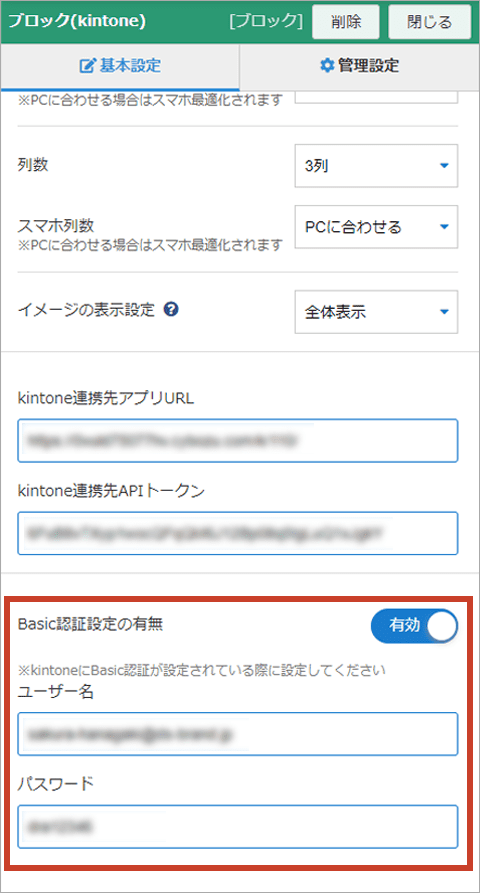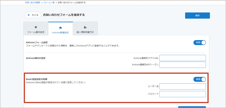 kintone側でBasic認証設定となっている場合は、設定を"有効"にして「ユーザー名」、「パスワード」を入力して完了となります。