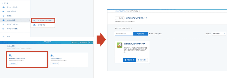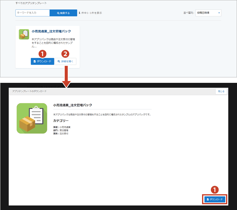 kintoneアプリテンプレートについて kintoneアプリテンプレートのダウンロードページ 「kintoneアプリテンプレート」の画面では、kintoneアプリのテンプレートをダウンロードできます。業務効率化を図れる様々なアプリテンプレートをご提供いたします、ぜひご活用ください。*アプリテンプレートは順次追加予定 操作方法 おりこうブログの左側上部にある「機能一覧」の kintone各種 > kintoneアプリテンプレート をクリックして一覧画面を表示します。 ダウンロ―ド可能なアプリテンプレートが一覧で表示されますので、使用したいアプリテンプレートの ①ダウンロード をクリックします。②詳細を開くボタン をクリックすると、アプリテンプレートについての詳細情報を確認できます。