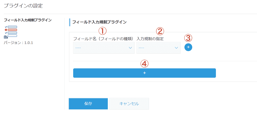 ④入力規制の追加 | ①フィールド名、②入力規制の指定 の設定項目を新たに追加できます。 |