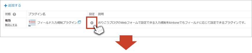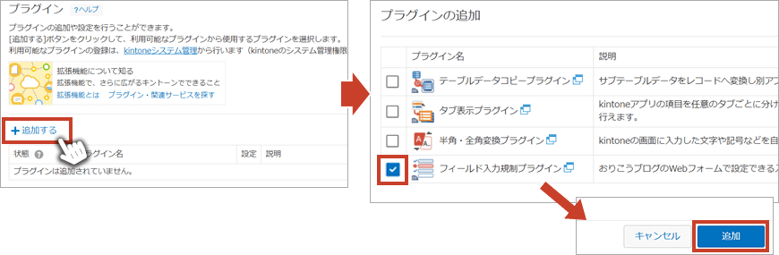 「追加する」をクリックし、「フィールド入力規制プラグイン」にチェックを入れ、画面右下の「追加」をクリックするとアプリにプラグインを追加できます。