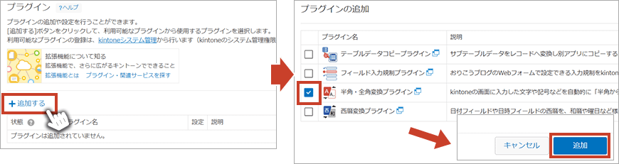 「追加する」をクリックし、「半角・全角変換プラグイン」にチェックを入れ、画面右下の「追加」をクリックするとアプリにプラグインを追加できます。