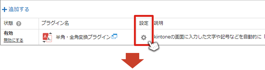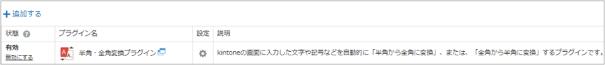 プラグインの設定を行います。「半角・全角変換プラグイン」の歯車マーク( )をクリックして、設定画面を開きます。