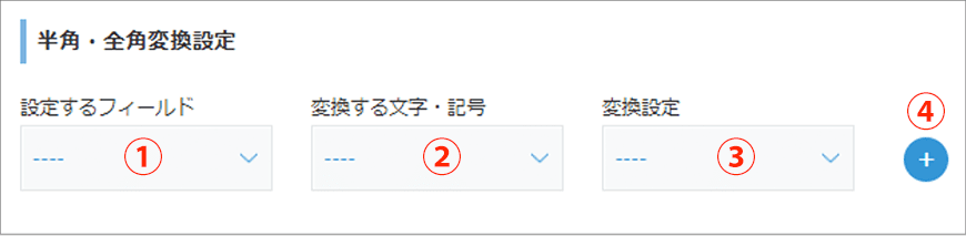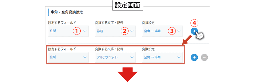 ③変換設定を "全角→半角"に設定します。複数の設定を行いたい場合は、④変換設定の追加 の+ボタンをクリックして設定箇所を追加します。