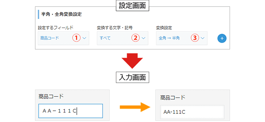 ①設定するフィールドで ”商品コード” を選択し、②変換する文字・記号を ”すべて”に、③変換設定を "全角→半角"に設定して保存します。
