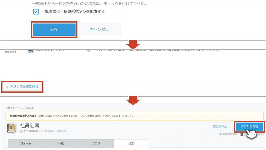 設定内容を確認し、「保存」ボタンをクリックします。その後、アプリ設定画面に戻り「アプリを更新」ボタンをクリックして保存すると設定が完了となります。