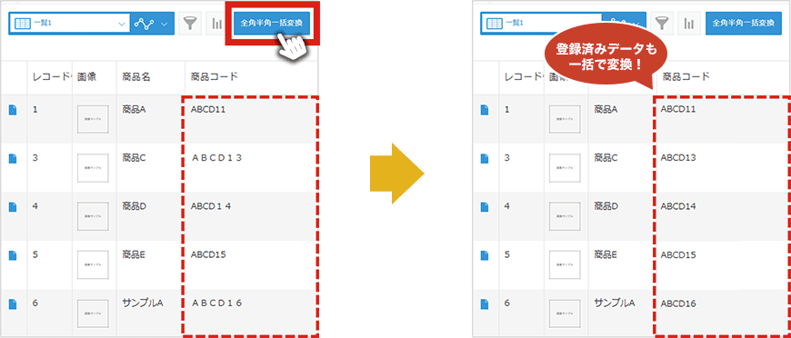 一覧画面に配置された「全角半角一括変換」ボタンをクリックすると、既存レコードに一括更新が行えます。