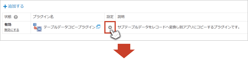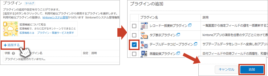 「追加する」をクリックし、「テーブルデータコピープラグイン」にチェックを入れ、画面右下の「追加」をクリックするとアプリにプラグインを追加できます。