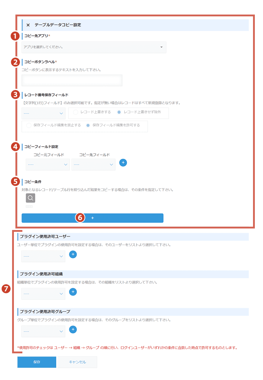 ⑦プラグイン使用許可設定 | ユーザー/組織/グループ単位でプラグインの使用許可を設定できます。※いずれも指定がない場合は、全ユーザーが使用できます。 |
