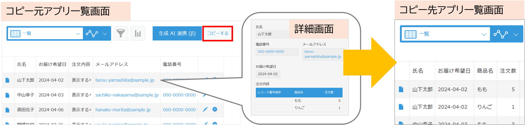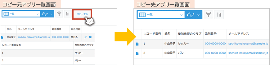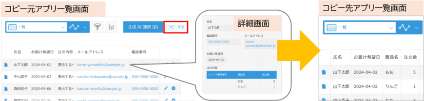①コピー先アプリ | プルダウンメニューからコピー先を選択します。または、アプリ名を検索して選択します。 |