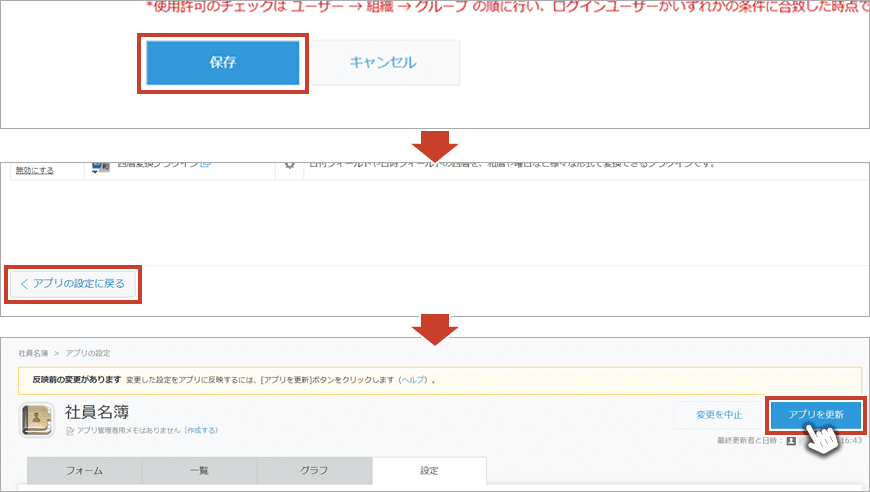 ④コピーフィールド設定 | コピー元と、コピー先のフィールドを設定します。(コピー元はテーブル外の項目も指定)原則として、コピー元とコピー先のフィールド種類は同一のものである必要があります。 ただし、コピー元フィールドの種類が下記のものである場合は、コピー先フィールドに "文字列(1行)フィールド" を指定することができます。