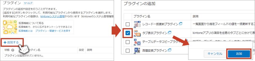 「追加する」をクリックし、「タブ表示プラグイン」にチェックを入れ、画面右下の「追加」をクリックするとアプリにプラグインを追加できます。