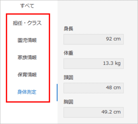 (例)保育情報に該当する項目(認定区分~卒業日までの範囲)をタブで表示したい場合