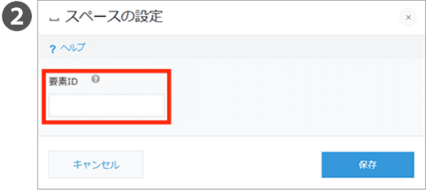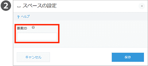 ③表示する範囲の設定 | 開始・終了それぞれに、範囲を指定する「対象ID」をプルダウンメニューから選択します。プルダウンメニューには、設定中の【スペースフィールド】の ”要素ID名” が表示されます。 |